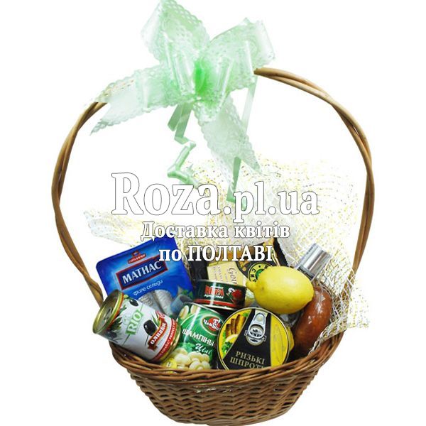Корзина с водкой и разными продуктами